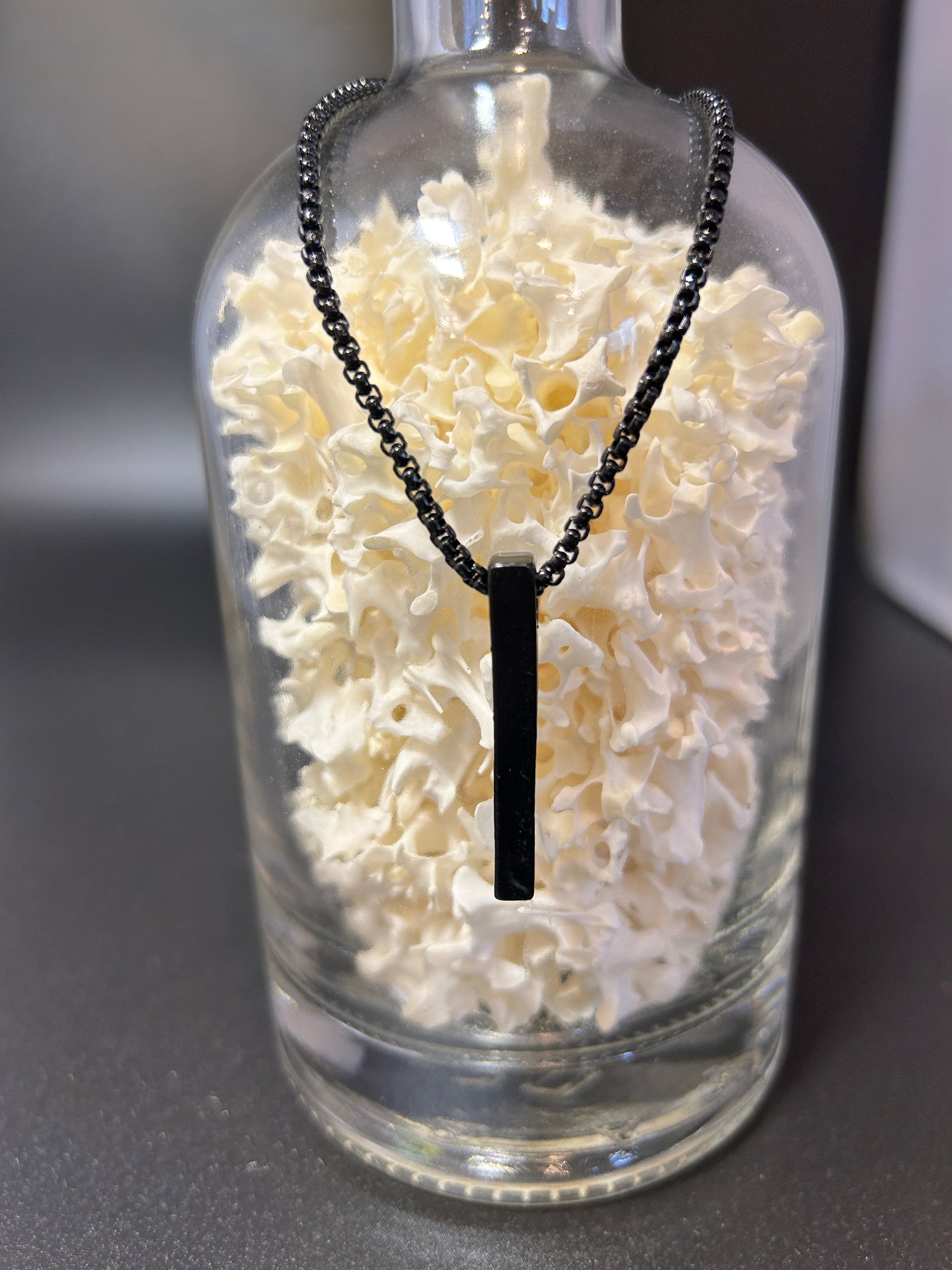 Made with stainless steel, this Black Rectangle, suitable for any gender with a 23.5 inch black metal chain.
